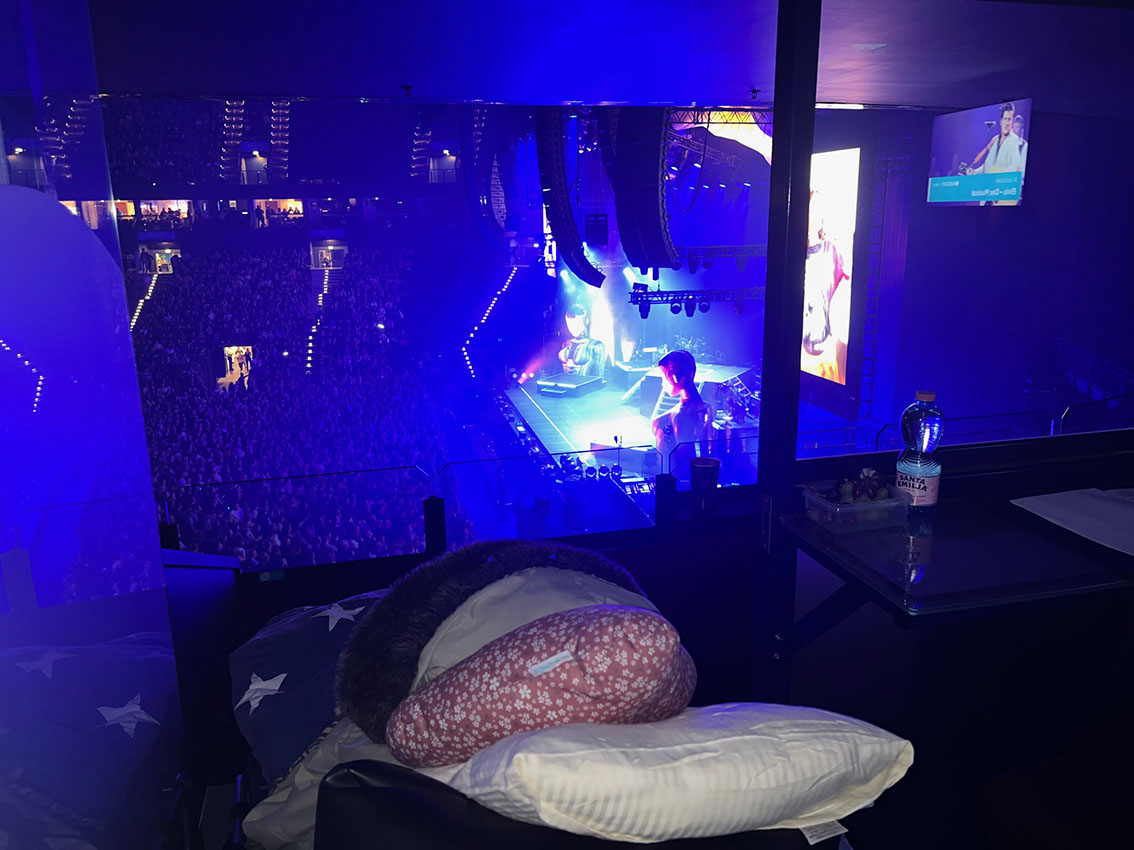 Auch die Mitarbeitenden der Barclays Arena spielten bei der Umsetzung des Herzenswunsches von Frau S. eine große Rolle. Dank der großartigen Unterstützung durften wir sogar exklusiv eine der begehrten Logen nutzen. Unser Fahrgast konnte das Konzert nur noch liegend genießen und hatte so freie Sicht auf die Bühne.