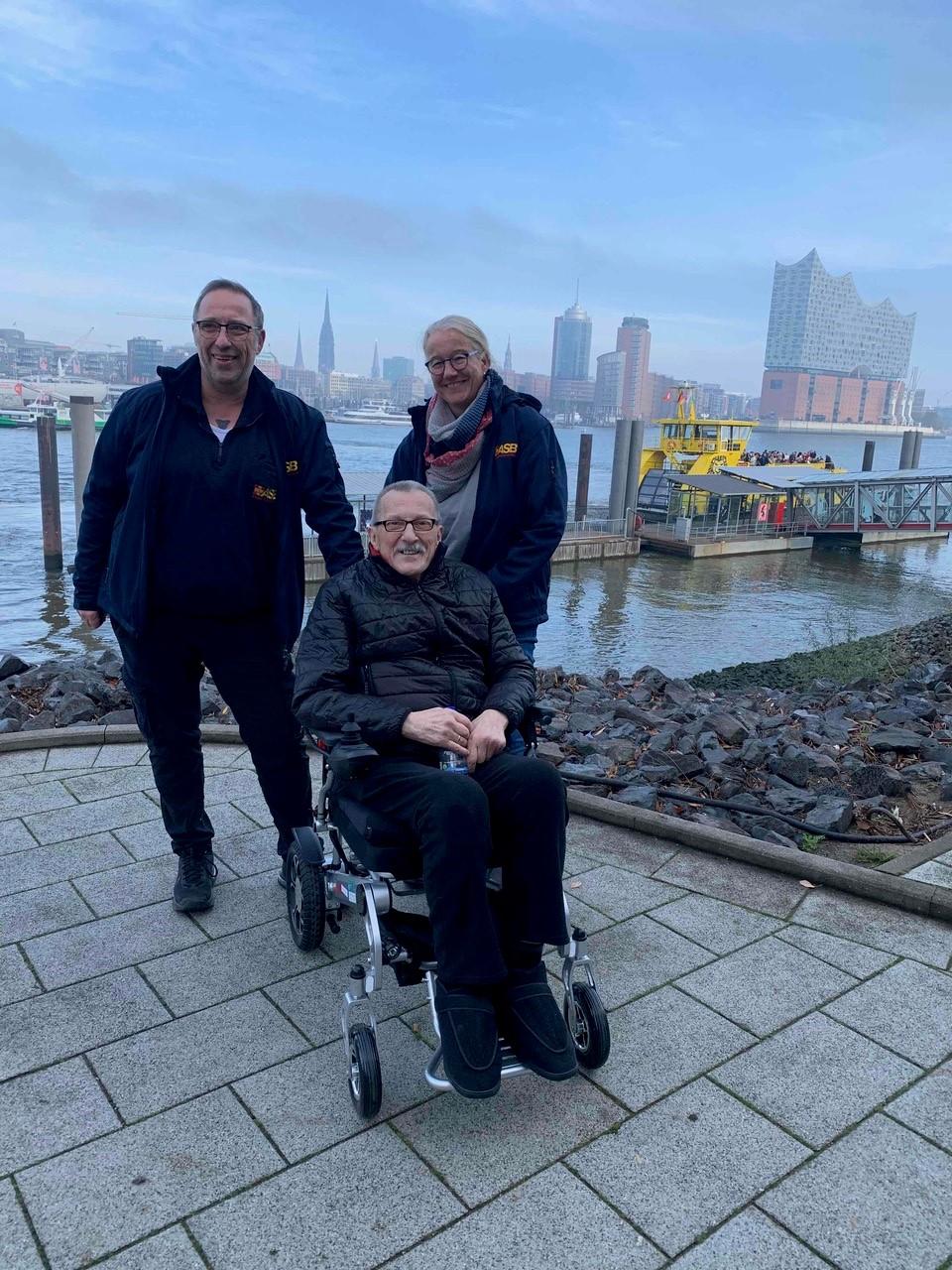 Etwas früher als geplant erreichen wir das Pflegeheim, wo Herr S. schon startklar im Rollstuhl auf uns wartet. Wir überzeugen ihn, die Fahrt gemütlich liegend auf der Trage zu genießen. Da seine Nichte Bettina später dazukommt, setze ich mich zu ihm, und Malte chauffiert uns auf einer schönen Route zurück nach Hamburg. Herr S. ist in gespannter Vorfreude und erzählt mir von seinem bewegten Leben: von Reisen um die Welt, von Jahren in verschiedenen Ländern. Die Fahrt vergeht wie im Flug, denn Herr S. hat viel erlebt und es macht Freude, ihm zuzuhören.