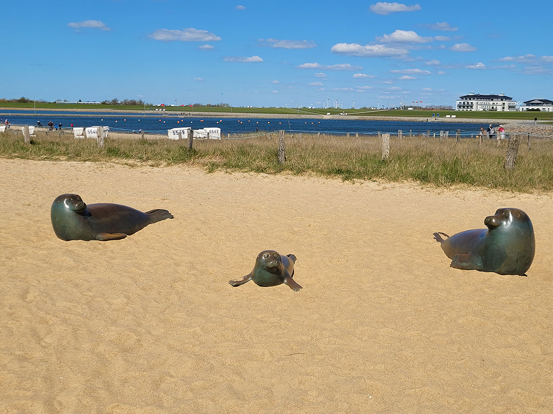 Anschließend ging es auf dem Deich weiter zur Perlebucht, einer kleinen Nordsee-Lagune. Eine Möglichkeit, mit dem Rolli ganz dicht ans Wasser zu kommen, war schnell gefunden und so standen die Wegeners im Nu im kühlen Nass und genossen sichtlich den Moment. Pläne wurden geschmiedet, doch noch einmal gemeinsam mit dem Enkel hierher zu kommen. Man konnte den wieder aufkeimenden Lebensmut förmlich greifen; ein berührender Moment für Vera und mich.