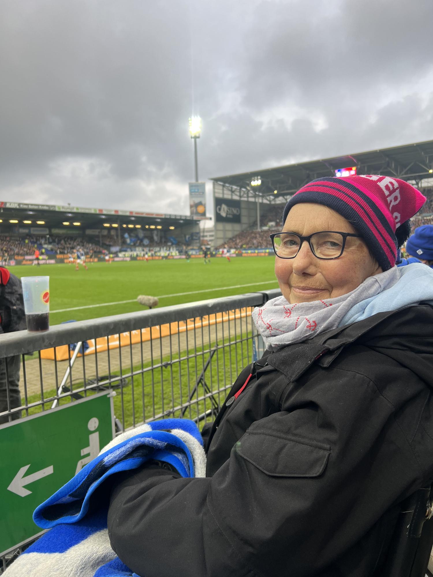 Diesen Wunsch hatte Conny auf dem Zettel. Ihre Tochter Mella kontaktierte das Wünschewagen-Team. Wie es der Zufall wollte, stand das Auswärtsspiel gegen Holstein Kiel am 11. November auf dem Spielplan des HSV – nicht weit entfernt also von dem Hospiz Haus Porsefeld in Rendsburg, in dem Conny wohnt. Von dort starteten die Wunscherfüller:in Manuela und Lars gemeinsam mit Conny und ihrer Tochter Mella in Richtung „Kieler Störche“. Conny hatte sich mit ihrer HSV-Fankluft so richtig in Schale geworfen, und ein kleines Spalier entließ sie aus dem Hospiz.