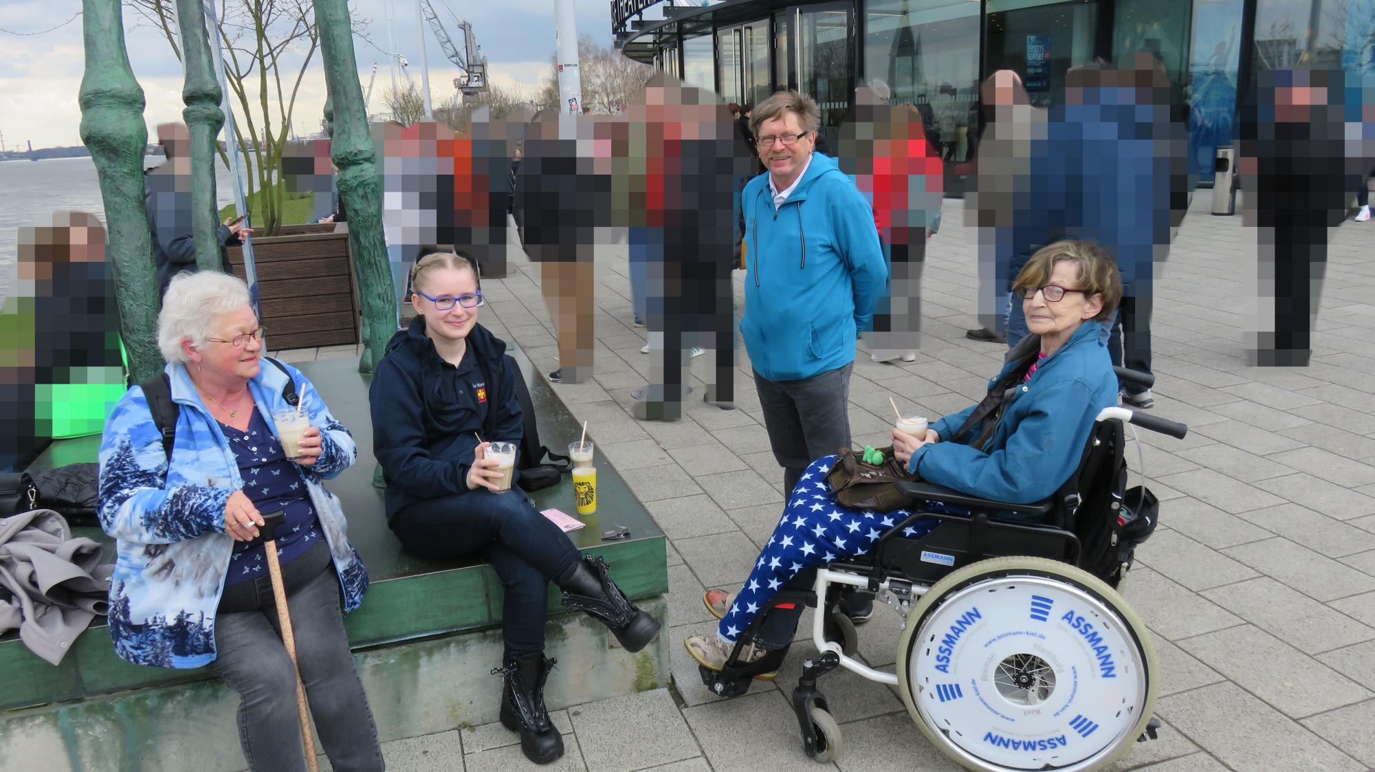 Als ihre Freunde da waren, ging es auch schon los Richtung Hamburg. Auf der Fahrt unterhielten sich alle angeregt, und dann wurde noch kurz ein kleines Nickerchen gehalten, damit alle fit für „König der Löwen“ waren. Dieses Musical zu sehen, hat sich Frau S. gewünscht. Vorort angekommen, war es zwar bewölkt, jedoch blieb es trocken und wir konnten die milden Temperaturen bei einem Latte Macchiato genießen.