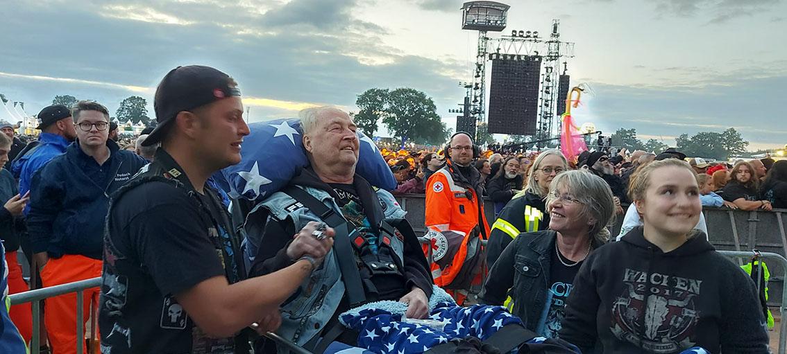 Am späten Freitagnachmittag trafen Nina und ich nun wirklich mit dem Wünschewagen bei Michael ein. Tränen der Begeisterung und Rührung flossen, so groß war die Freude, dass es jetzt doch wirklich losgehen sollte. Das beste Maiden Shirt wurde angezogen, darüber die Kutte mit den vielen Patches und Bändchen der vergangenen Wacken-Besuche. Gemütlich auf der Trage gebettet, und dann ging es los Richtung Holy Ground.